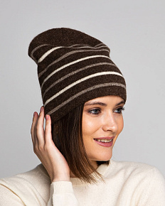 Красивая темно-коричневая шапка с полосками. которые ее очень украшают.