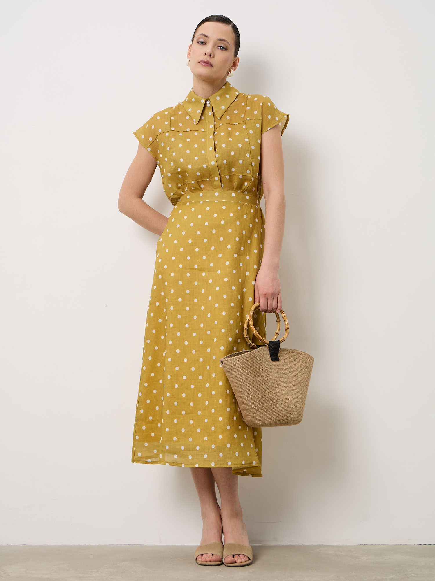 Зелёный оттенок с контрастным светлым горошком — свежая и выразительная комбинация, которая добавляет образу яркости и элегантности.