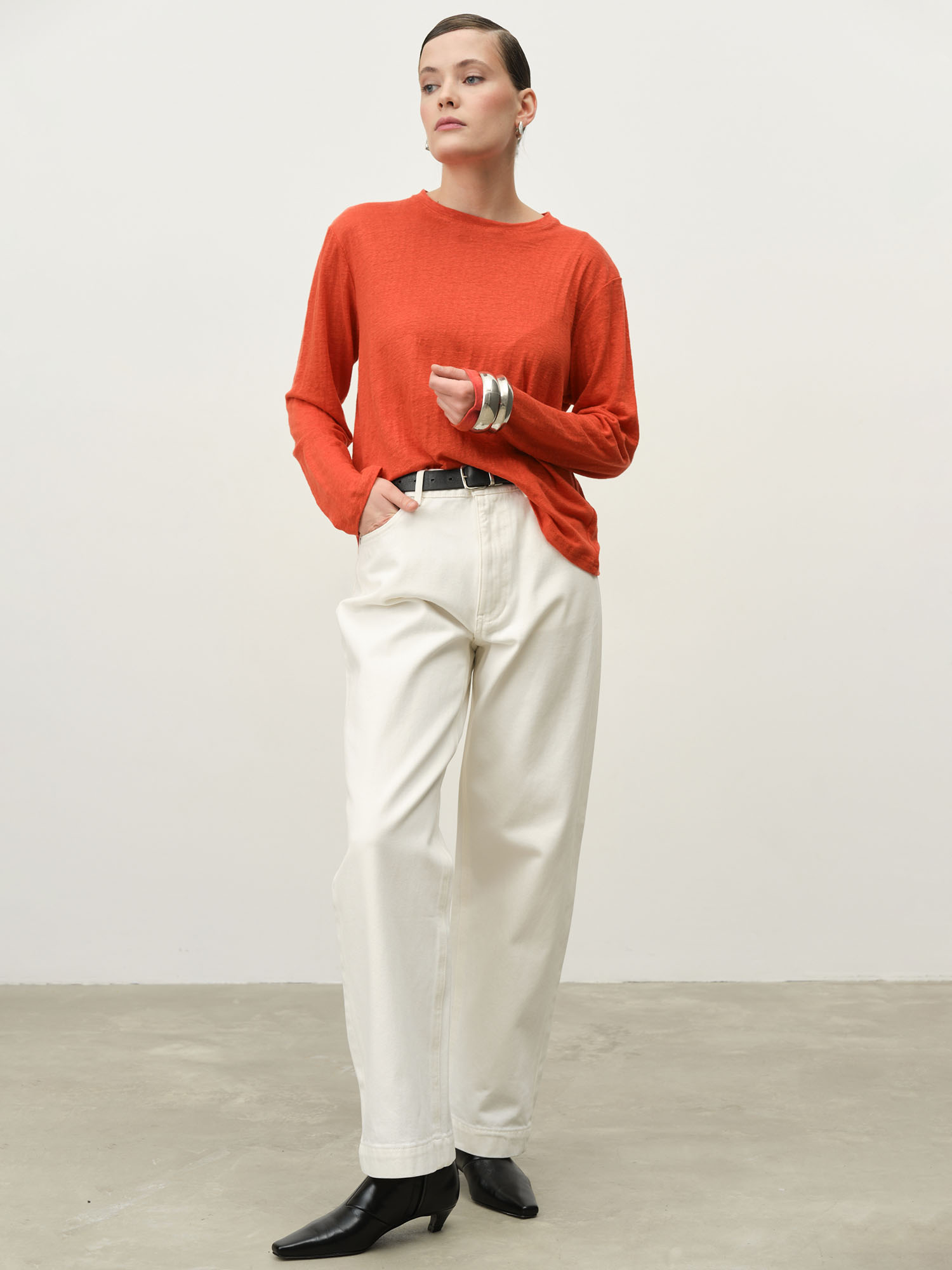 Свободный прямой силуэт с классическим круглым вырезом и длинными рукавами. Минималистичный крой делает модель универсальной.