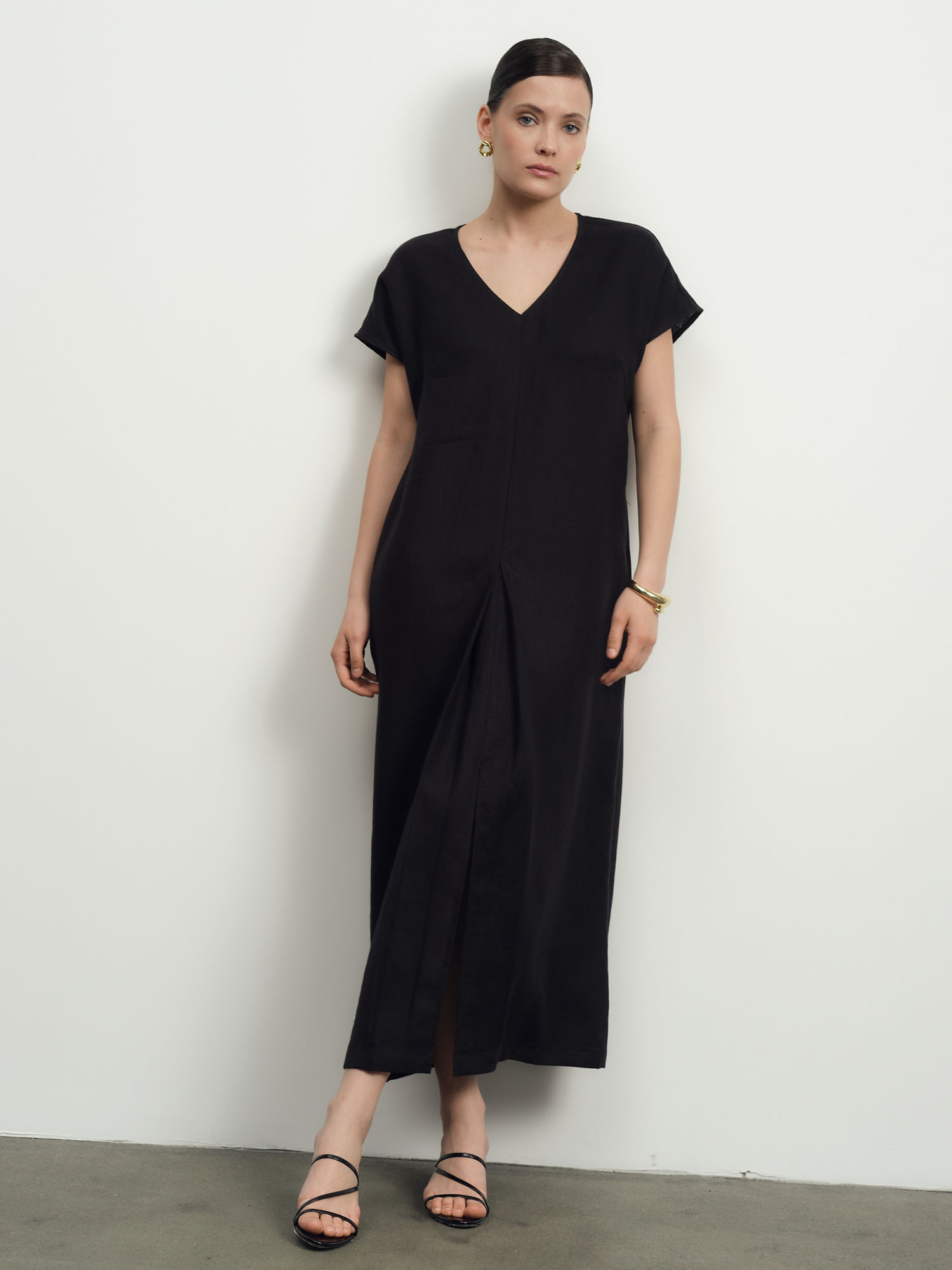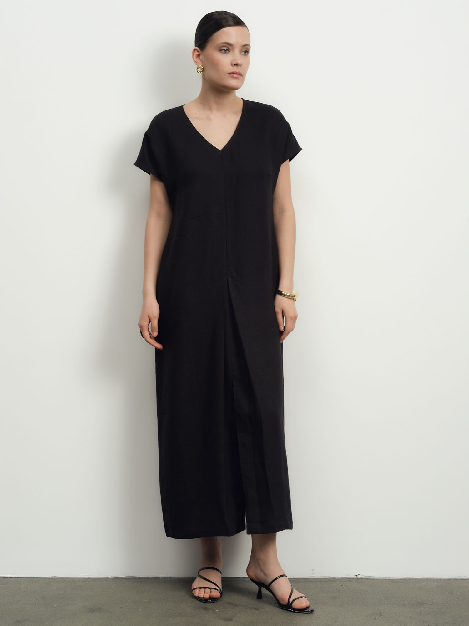 Прямой силуэт длины миди с V-образным вырезом и короткими рукавами. Минималистичный крой подчеркивает естественность и универсальность модели.