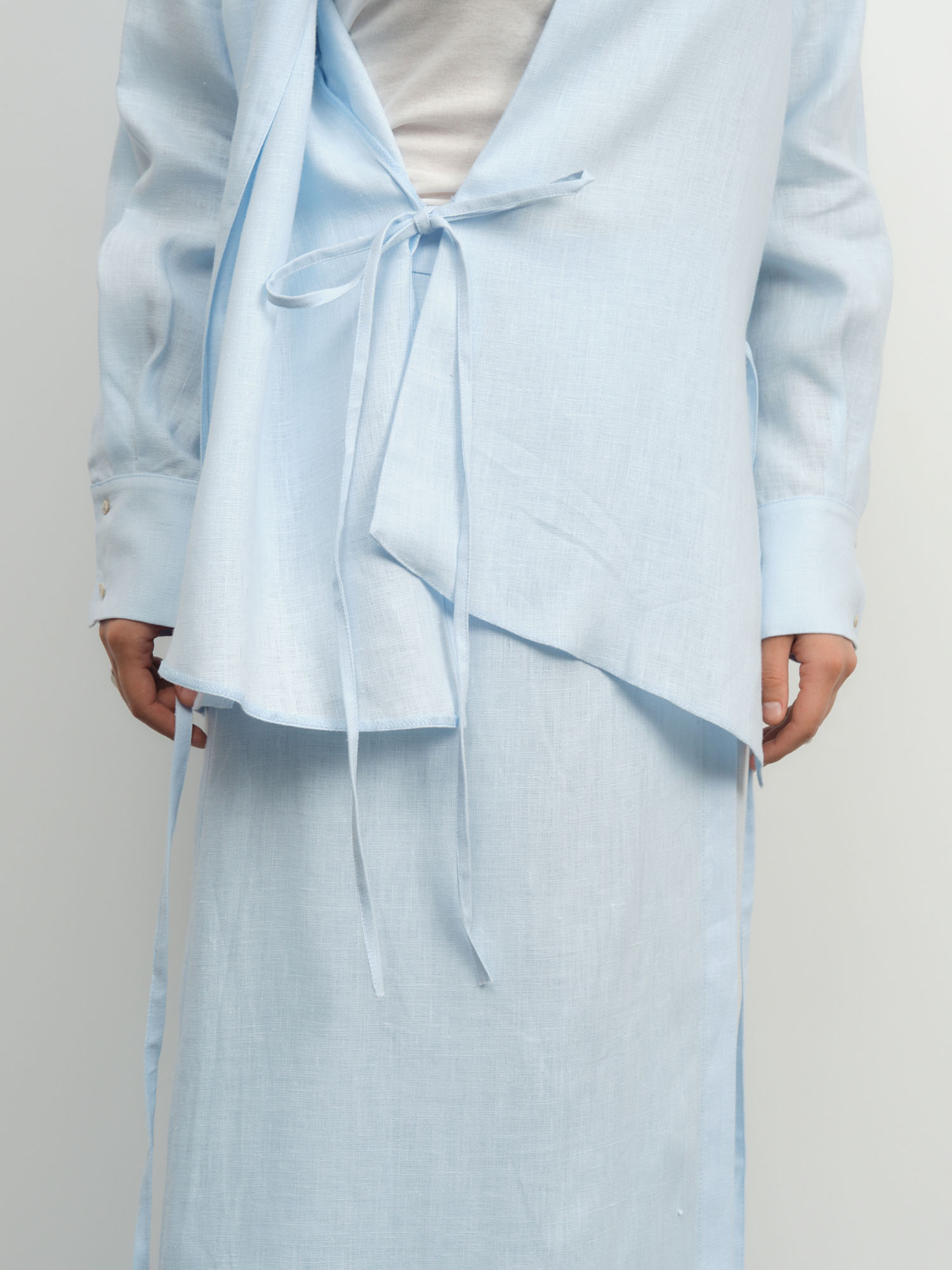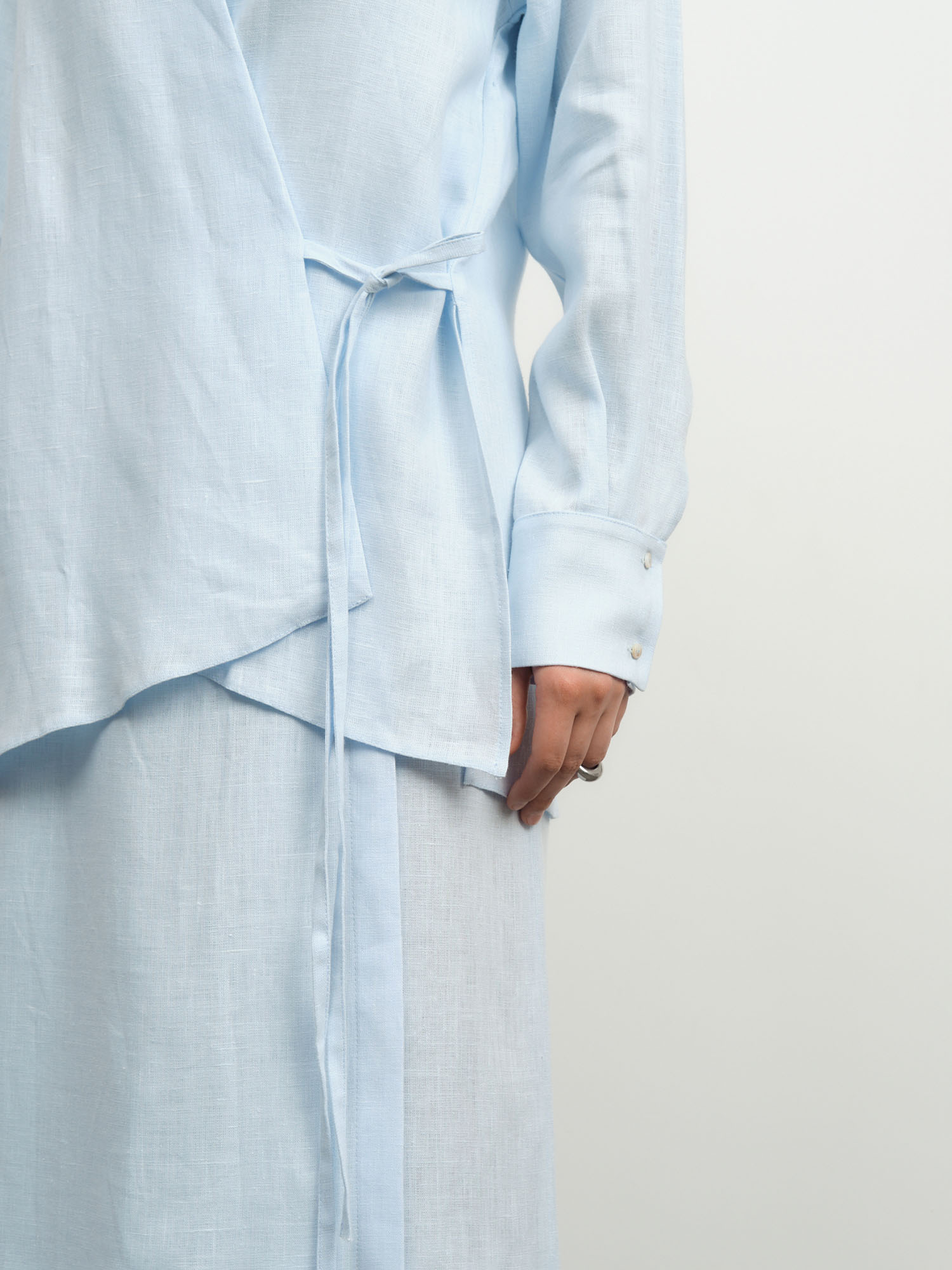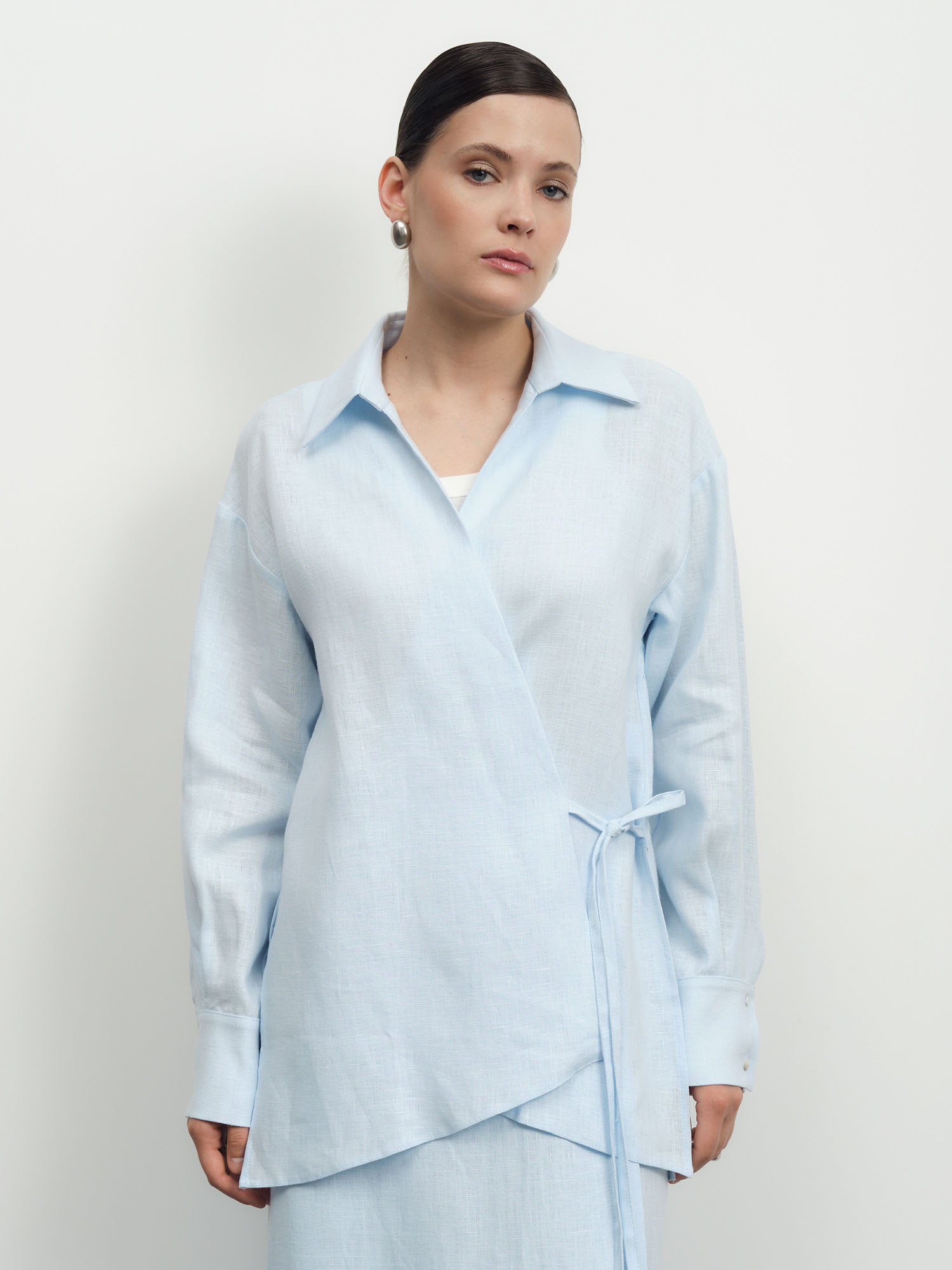 Модель с запахом и завязками, длинные рукава с манжетами, легкая фактурная ткань, аккуратные швы.