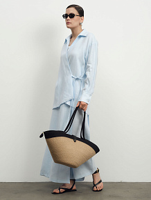 Свободный асимметричный силуэт с запахом и удлиненной линией низа. Отложной воротник придает образу аккуратность и стиль.