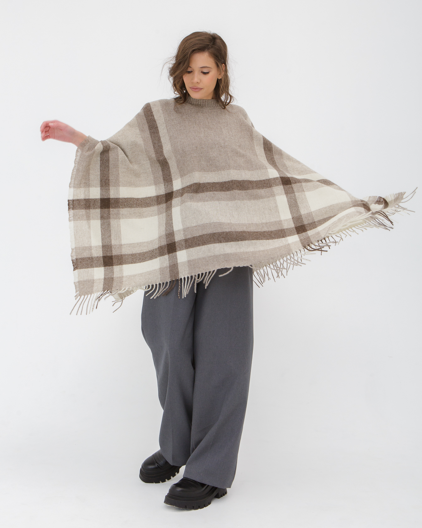 Формат пончо с широким кроем, декоративная клетка и аккуратная бахрома по краю создают эффектный и современный образ.